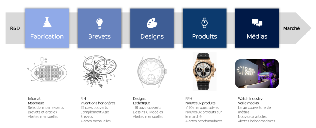 SCBT-CENTREDOC propose également un ensemble de publications de veille prêtes à l’emploi, couvrant les domaines clés de l’industrie horlogère. Ces veilles thématiques offrent une vision structurée et régulière des évolutions technologiques, créatives et marché, et couvrent l’ensemble de la chaîne d’innovation horlogère, de la R&D au marché.
